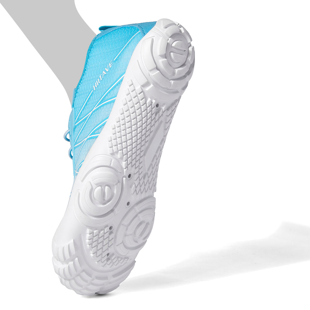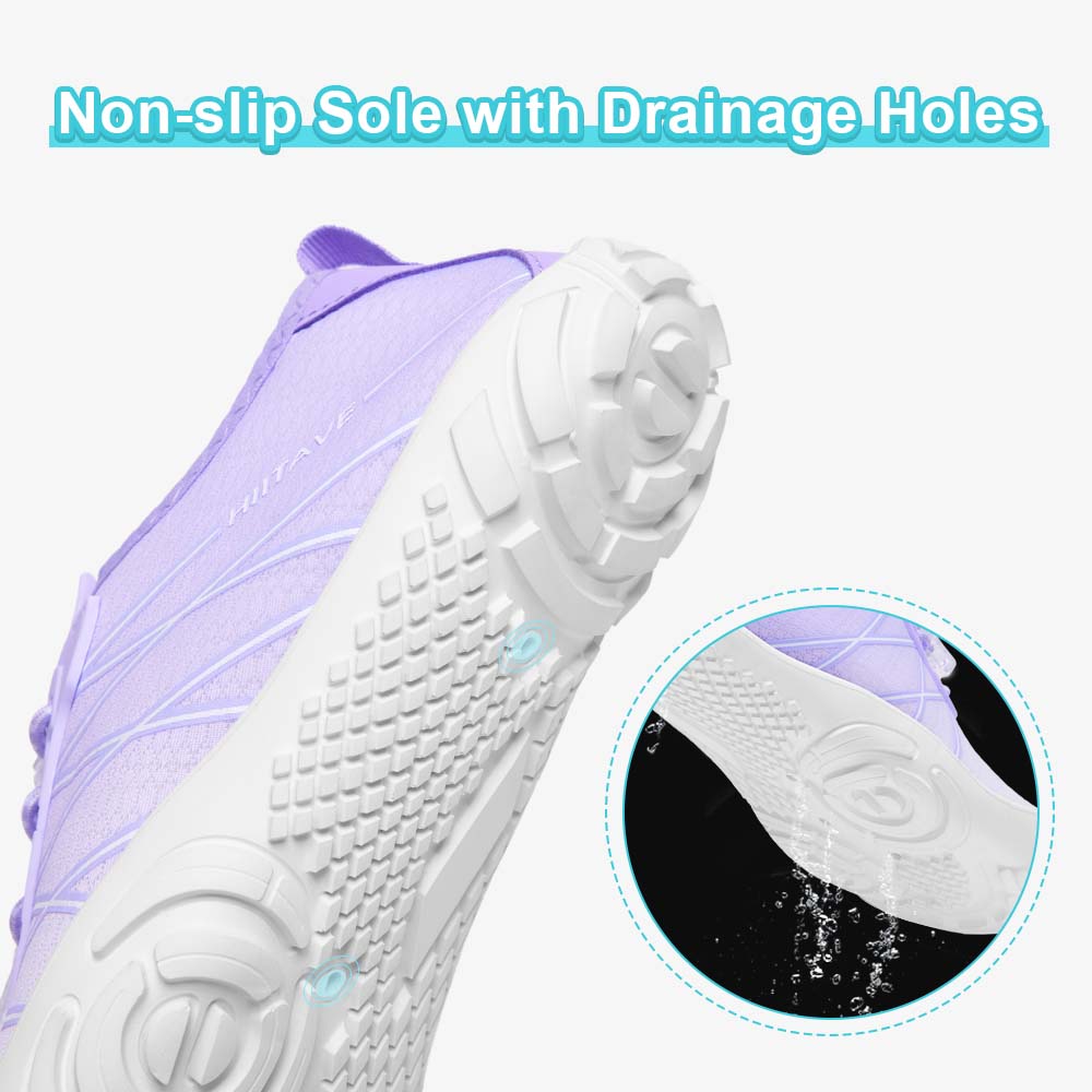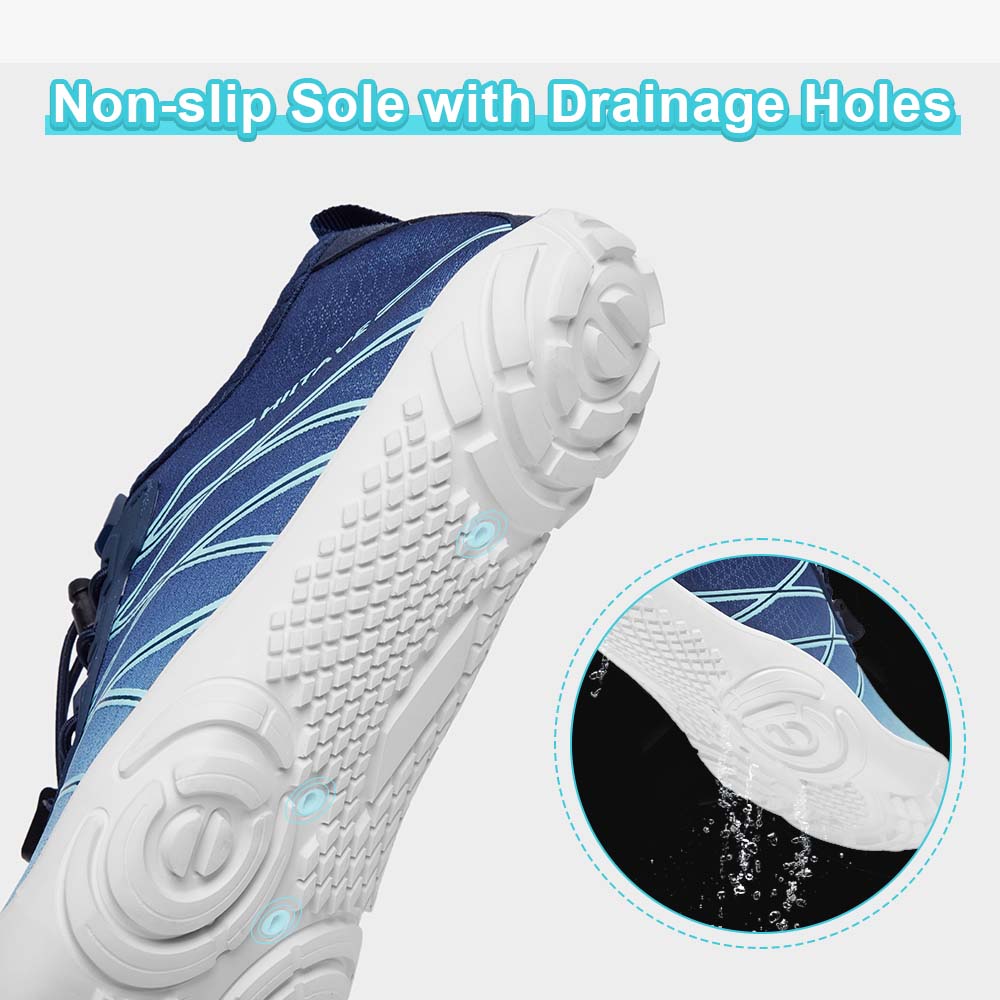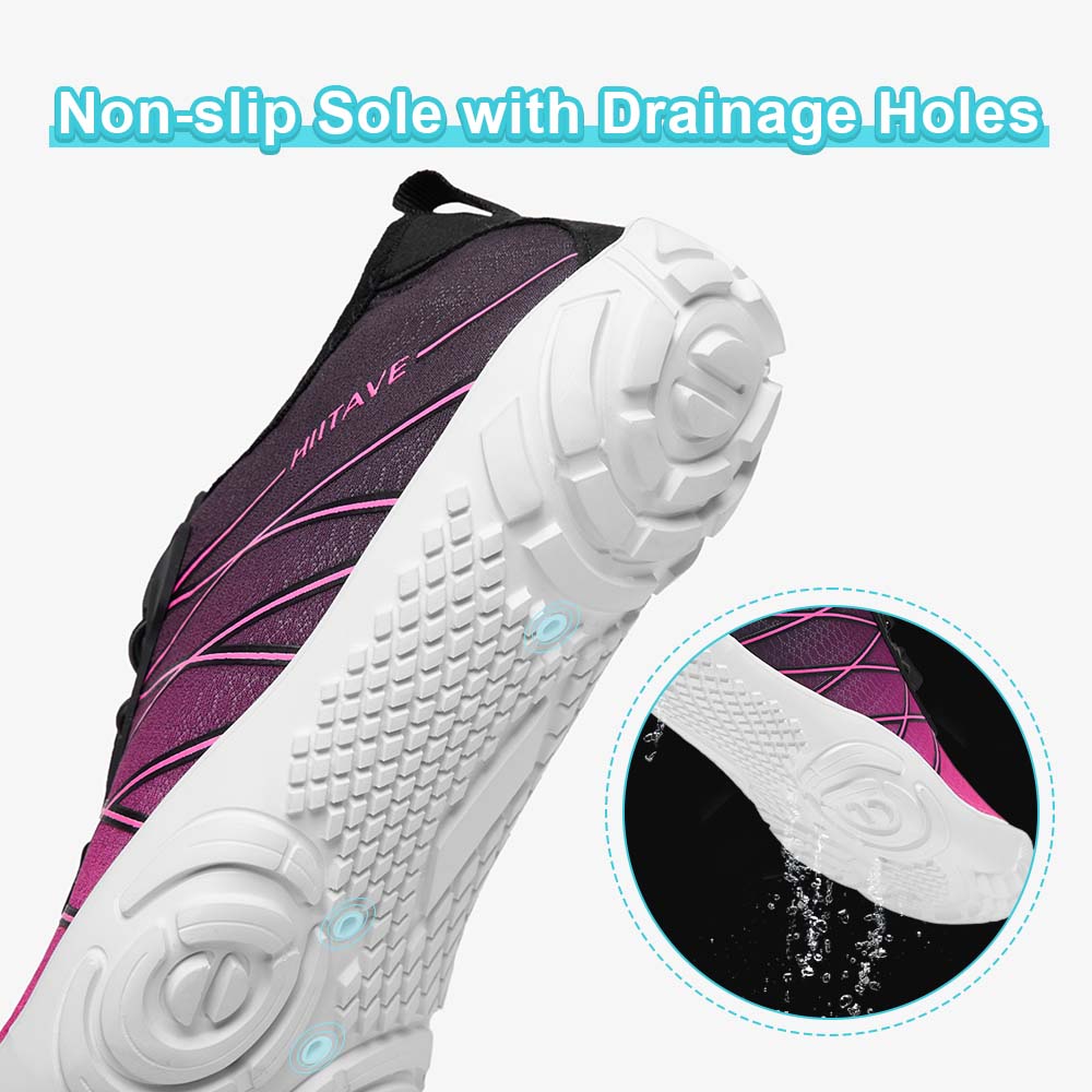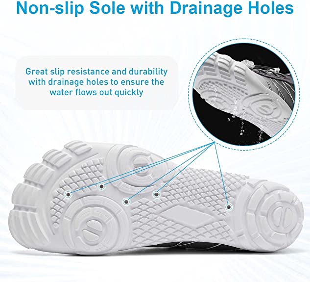 - Durable & Non-slip: Durable nonslip rubber outsole with a unique pattern, increases friction and track adhesion, prevents slips and falls, and protects your feet from sharp rocks and stones.5 holes on each bottom to ensure proper water flow out of them.